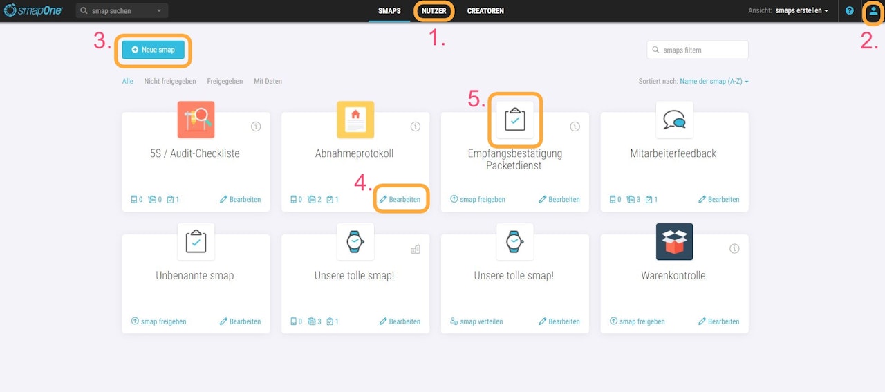 Hier laufen für Dich als Creator die ersten Informationen zusammen, wie angelegte smaps, Datensätze zu bereits verteilten smaps, Anzahl offener Aufgaben einer smap oder ob die smap überhaupt freigegeben ist und auch schon an Nutzer verteilt wurde.