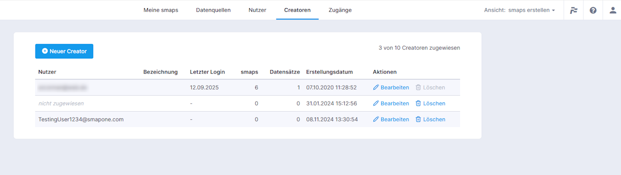 Das Verwaltungskonto dient im Unternehmen dazu, selbstständig weitere Creatorenaccounts anlegen zu können, unter der Voraussetzung, dass die Login-E-Mail-Adresse des künftigen Creatorenaccounts bereits in der Nutzerliste des Verwaltungskontos als Nutzer E-Mail-Adresse aufgeführt ist.