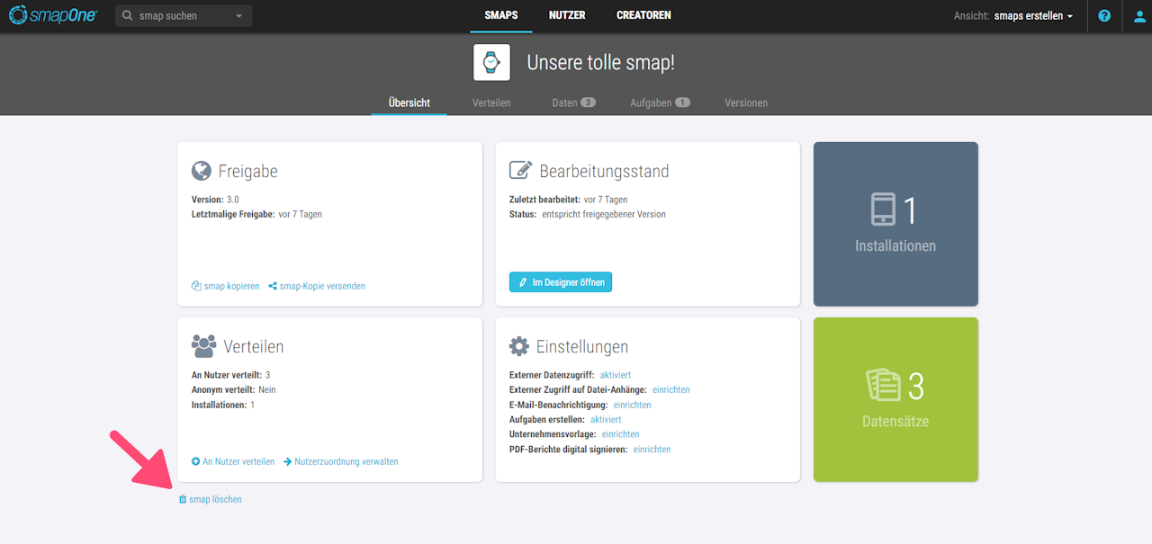 Bei dem Löschvorgang werden unwiderruflich alle dazugehörigen Daten gelöscht. Falls die ausgewählte smap bereits installiert wurde, wird diese ebenfalls von dem Endgerät des Nutzers entfernt.