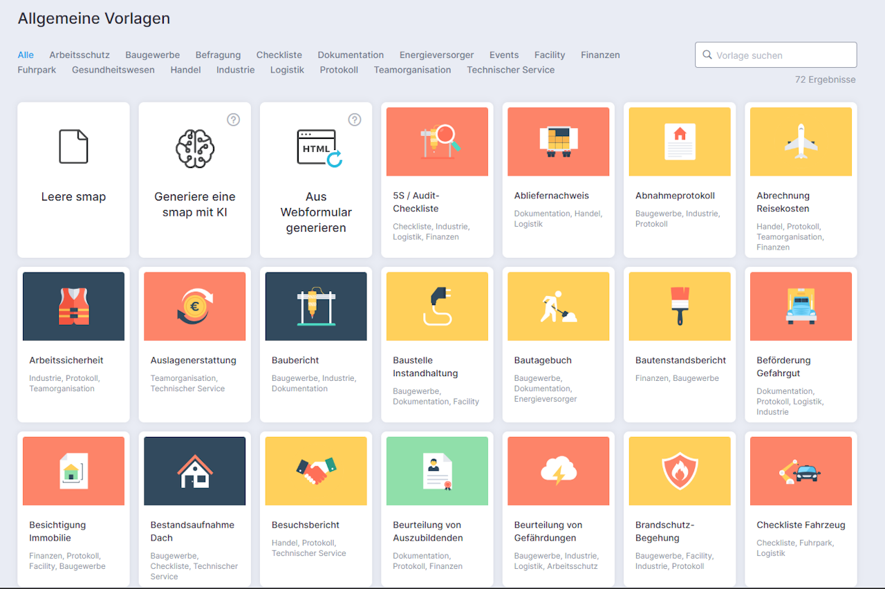 Als Orientierung oder Eingrenzung kannst du die Templates nach einer Branche filtern. Wenn du also sehen möchten, welche smaps sich für den Einsatz von Logistikern eignen, wähle einfach die entsprechende Branche aus.