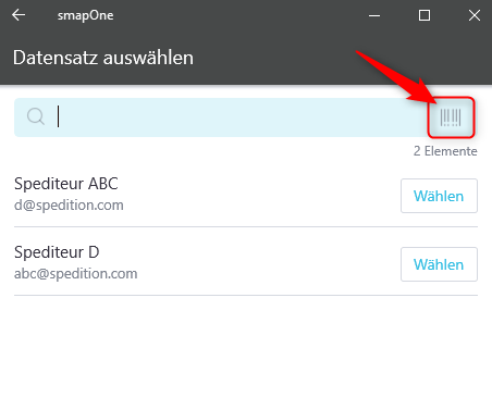 Ebenso kann über das Suchfeld die Bar- und QR-Code Scanfunktion aktiviert werden. Dadurch kann auch die hinterlegte Liste nach dem gescannten Wert durchsucht und bei Übereinstimmung(en) ausgewählt werden.