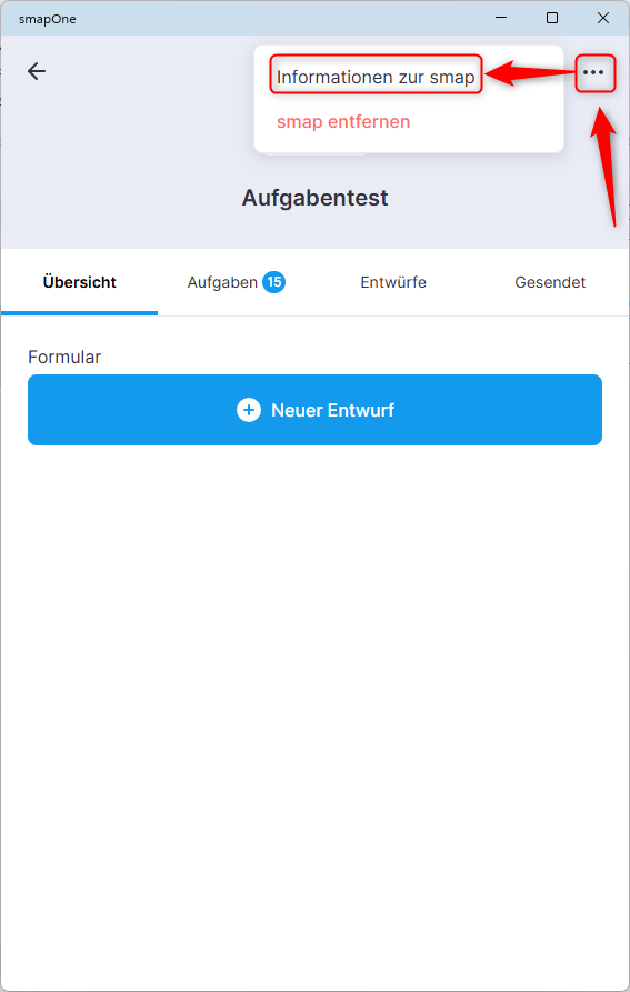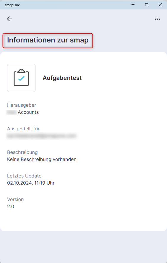 Öffne dazu auf Deinem Endgerät die smapOne App und die entsprechende smap. Nun kannst Du mit Klick auf die drei Punkte das Menü Informationen zur smap öffnen. Unter Informationen zur smap kannst Du die aktuell auf dem Gerät installierte smap Version einsehen.
