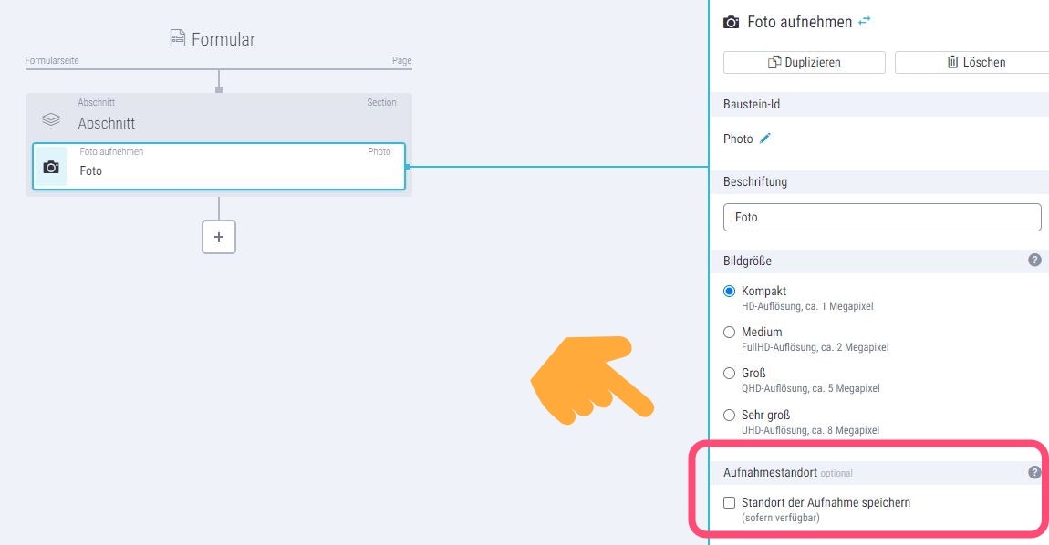 Um die Standortdaten auch über den Fotobaustein erfassen zu können, muss zum einen die entsprechende Funktion, wie im Screenshot zu sehen, im Designer nach Auswahl eines Fotobausteins "Standort der Aufnahme speichern" durch setzen des Hakens in der Checkbox aktiviert werden.