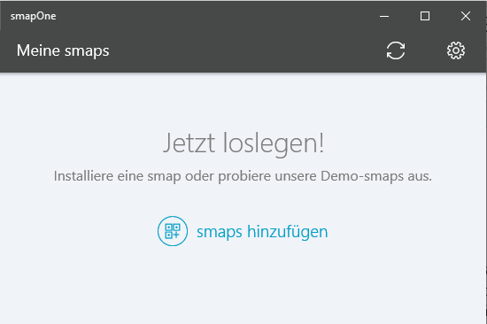 All smaps assigned to you or to a user (identification via e-mail address) can be brought up directly in the smapOne app. To do this, click on the grey "plus" icon in the main screen of the smapOne app. If you have not yet installed any smaps, "Add smaps" is displayed in the center instead.