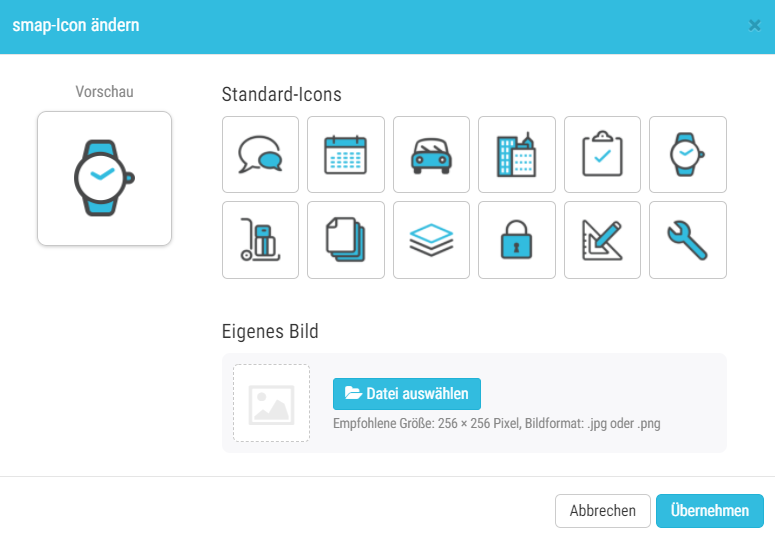 Yes, the logo or icon of a smap can be changed. A selection of universal icons is provided for this purpose. You can also upload your own graphic files (recommended size: 256 × 256 pixels, image format: .jpg or .png).
