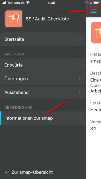 To do this, open the smapOne app and the corresponding smap on your device. Now you can open the smap information menu by clicking on the three dashes arranged one below the other. By clicking version you can then view the smap version which is currently installed on the device.