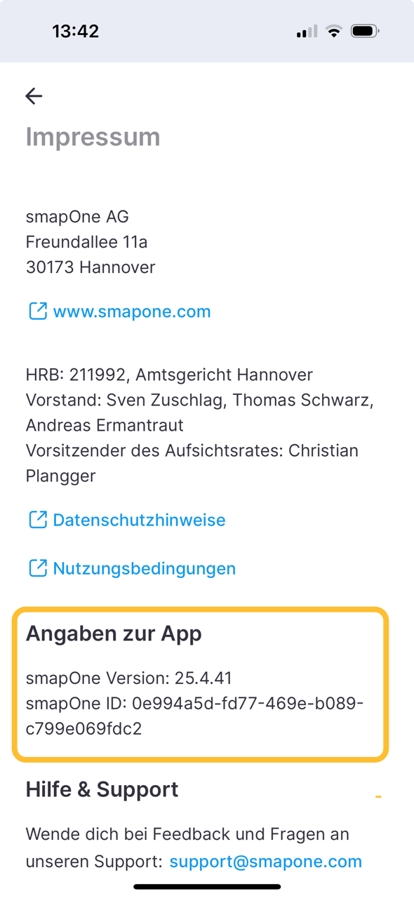 The version can be viewed by clicking on the dots menu at the top of the smap overview. This opens the imprint of the smapOne app, where the version number is listed.
