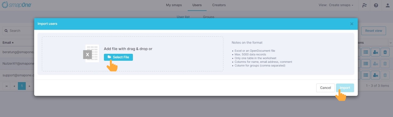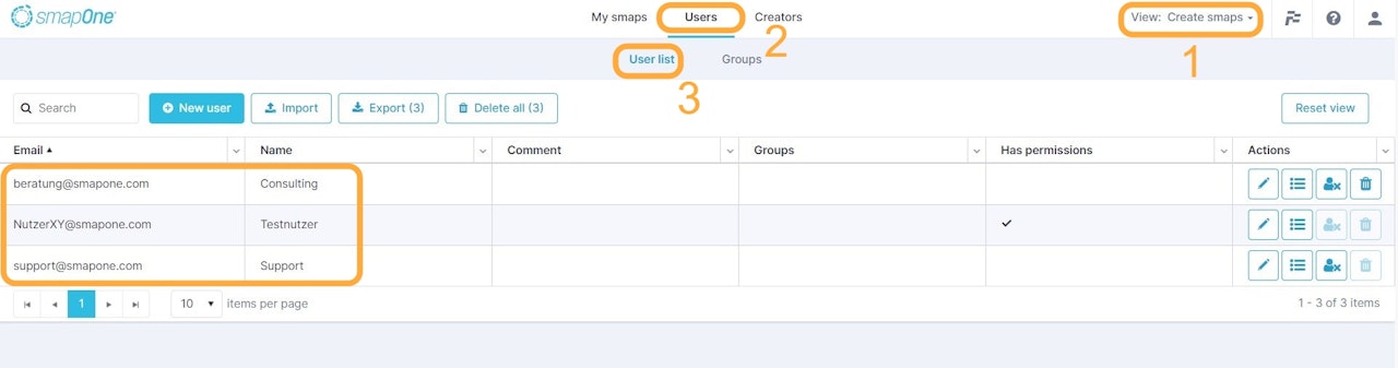 When managing groups, you can define which users should be assigned to which group. The creation and use of a group can be very helpful if smaps are to be assigned to or withdrawn from several users with just a few clicks.