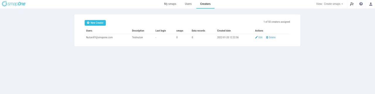 The managing account is used in the company to be able to independently create further Creator accounts, provided that the login e-mail address of the future Creator account is already listed in the user list of the administration account as the user e-mail address.